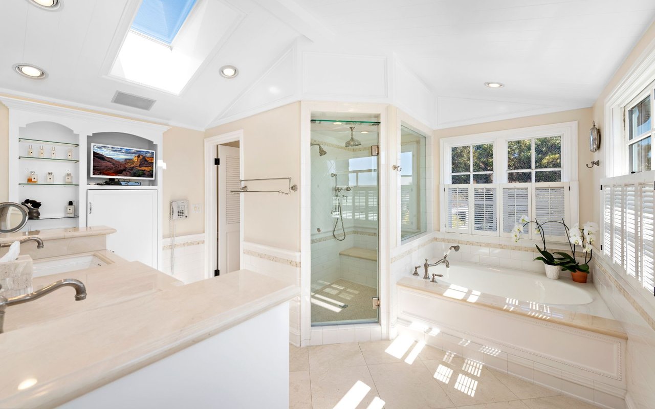BACK ON THE MARKET! Buyer's loss is your gain...a window of opportunity has been presented to seize this amazing home! Located in the coveted neighborhood of Shore Cliffs, this Hamptons-inspired property, along with a separate Carriage House, represents relaxed coastal living. Extensively remodeled in 2008, the home exudes timeless beauty throughout. To the left of the Dutch door entry, the office features beautiful pine built-ins and doors that open to the Porte Cochere…inviting fresh breezes and soothing fountain sounds. The large living room is graced with an abundance of windows, a wood-burning fireplace, and wainscoted walls. Down the hall is a remodeled bathroom and a well-positioned anteroom, perfect for transitioning guests to the kitchen, dining room, or family room. The kitchen boasts soapstone counters, a center island, new dual-ovens, a walk-in pantry, and relaxed built-in seating. Upstairs are 4 bedrooms, 2 full baths, and a bonus space with a large desk and TV viewing area. The Master suite offers panoramic ocean views, cathedral ceilings, dual walk-in closets, and a spa bathroom with skylights and views. Lush landscaping highlights the oversized backyard and includes a heated pool, jacuzzi, built-in barbecue, and a wood-burning fireplace to enjoy cool coastal evenings. Last but not least, the 2 story Carriage House showcases a kitchen, laundry, and desk area downstairs...and a spacious upstairs with 1 bedroom, 1 bath, and a viewing deck. Shore Cliffs offers private access points to sandy beaches & vistas, and proximity to wonderful shopping and dining in the Village.